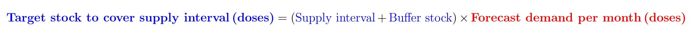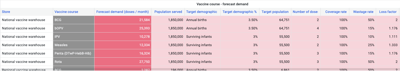 - Population coverage, supply interval and buffer stock for each facility (see Manage > Store properties)