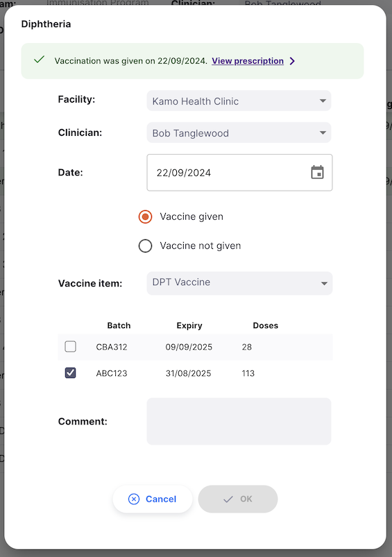 If a vaccine item and batch were selected, the system will automatically create and finalise a Prescription. Prescriptions are created for each vaccination record to track stock usage.