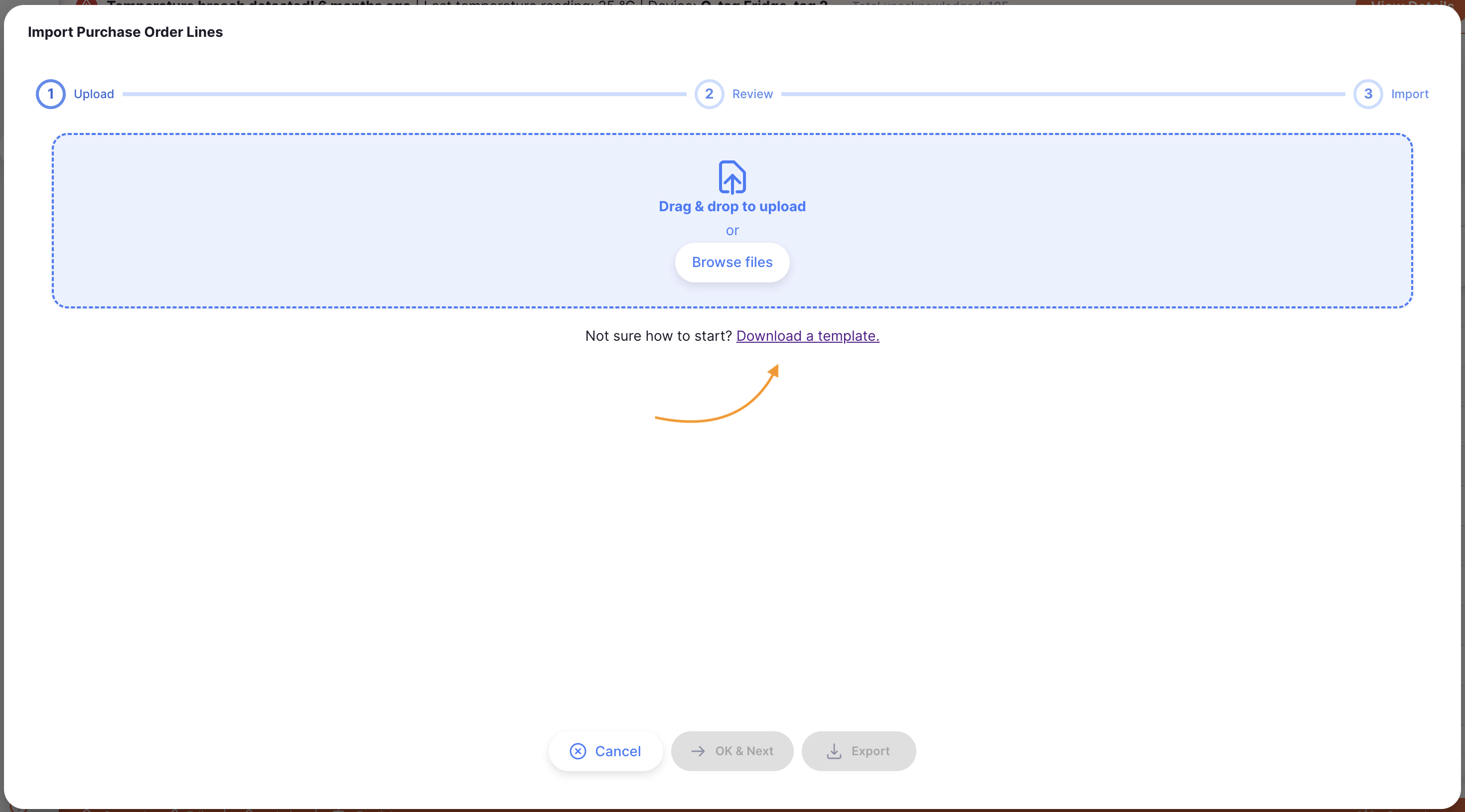 Une fenĂȘtre d'importation s'ouvrira. Cliquez sur TĂ©lĂ©charger un modĂšle pour tĂ©lĂ©charger un modĂšle CSV que vous pouvez utiliser pour importer des articles.