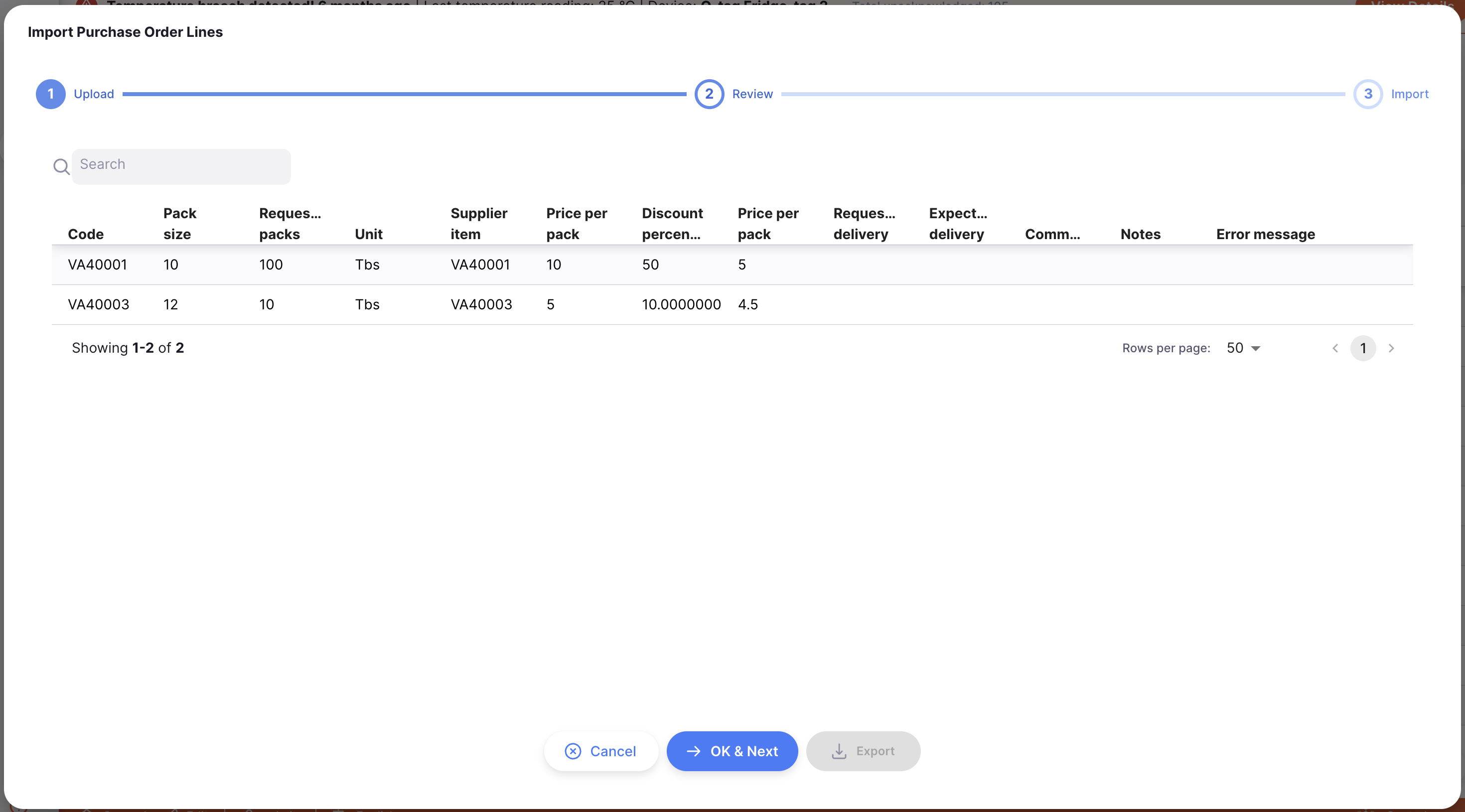 Des lignes de remplacement seront ajoutées à votre Commande d'Achat, affichées en police bleue avec une quantité de conditionnements à zéro. Vous pouvez ensuite les modifier en suivant les étapes décrites ci-dessus.